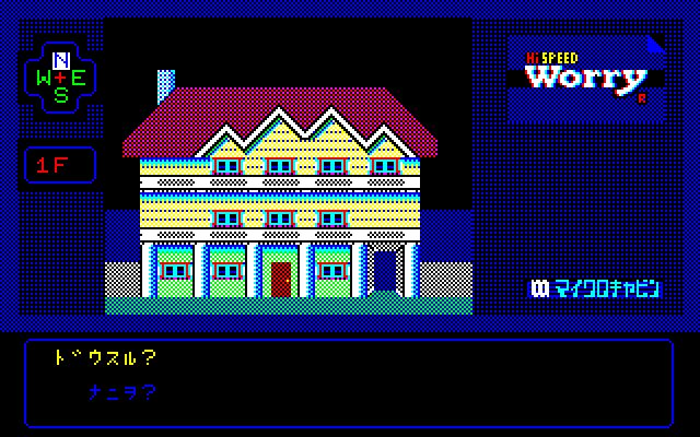 Worry is an adventure game in Japanese where the objective is to find treasure in a mansion. Several items can be found around the mansion that can be collected and need to be used in order to proceed.