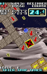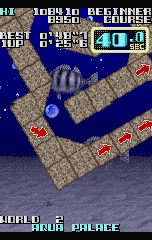 The game ran on Taito’s F1 system hardware and used the same optical rotary system utilized in Taito’s 1986 arcade game Arkanoid. It was later ported in 1992 to the Super NES, and in 1993 to the FM Towns computer. The Super NES release was titled On The Ball in North America and Europe, and was compatible with the Super NES Mouse. The gameplay consists of moving a ball through a labyrinth by rotating the board itself around the ball.