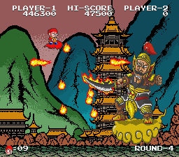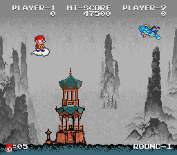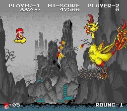 You play a small character who floats about on a cloud and shoots small balls of energy at bad guys who fly at you from the left and right of the screen. You can collect powerups and visit shops to upgrade your offensive and defensive powers. There are a number of different stages which are punctated by a mini-boss half way through and a big (literally) boss at the end.