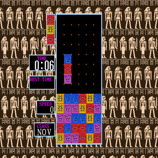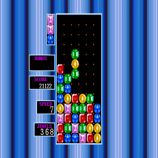 Columns is loosely derived from Tetris, as it involves arranging falling blocks in such a way as to clear them. However, in columns they are groups of 3 same-size but varying color blocks, which must be arranged into sequences of 3 or more, either horizontally, vertically or diagonally. Sequences of 4 or 5 count for double or triple points, and diagonal sequences score the most. The real trick is to set up ‘combos’ – where one line causes other blocks to drop so as to create other lines.