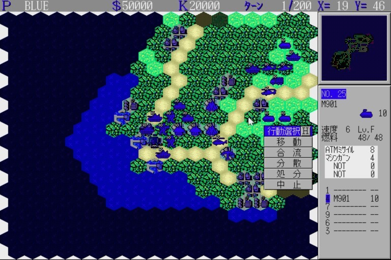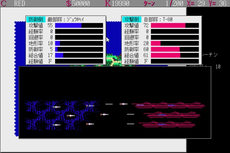 Daisenryaku II: Campaign Version is a turn-based war strategy game that relies on the gameplay template introduced in Daisenryaku II: up to four players engage in battles against each other or computer AI, represented by differently colored armies (blue, red, green, and yellow); the belligerents produce units and vehicles and navigate them on a hex-based grid, trying to occupy the enemy’s major cities and harbors.