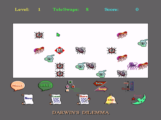 Darwin’s Dilemma is a puzzle game, the goal is to push matching creatures together. Make enough matches, and the creatures evolve in to new ones, which must then be further matched to evolve into a more advanced creature up the evolutionary chain, and so on. There’s also a limited amount of swaps which allow you to change creature place with Darwin.