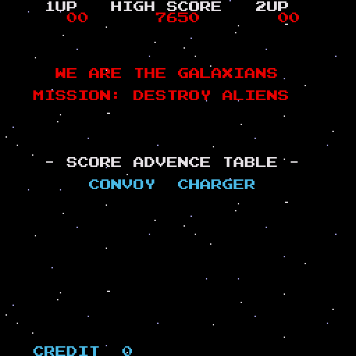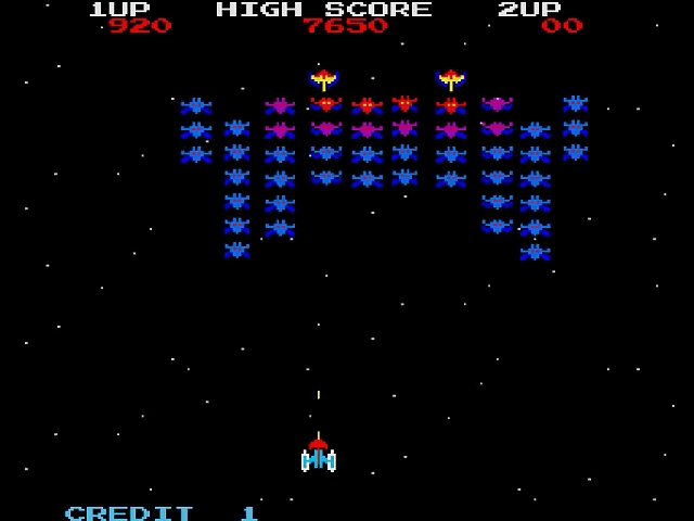 A incredibly faithful homebrew incarnation of this popular game, Galaxian is a shoot ’em up in which the player is at the bottom of the screen, with an arrangement of aliens at the top. The player moves left and right to aim at an alien, then shoots a bullet up the screen, and the alien it hits is killed. The aliens are classed as Drones, Emissaries, Hornets and Commanders, with those higher up the screen scoring more points when destroyed. At set intervals an enemy will move down the screen towards you, escorting a bomber, which is a moment of high danger. Clear a wave and another is generated.