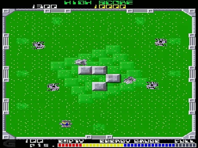Grobda is a spin-off from Xevious, as the titular tank was originally an enemy in that game. The player takes control of the eponymous Grobda tank in an arena filled with numerous indestructible obstacles and several enemy tanks. When an enemy tank is killed, it will cause an explosion which can destroy other tanks as well as the player if positioned in the blast radius at the time. There is a shield that offers temporary protection from enemy fire, but constant firing from enemies will make it disappear. The game consists of 99 rounds, called “battlings”.