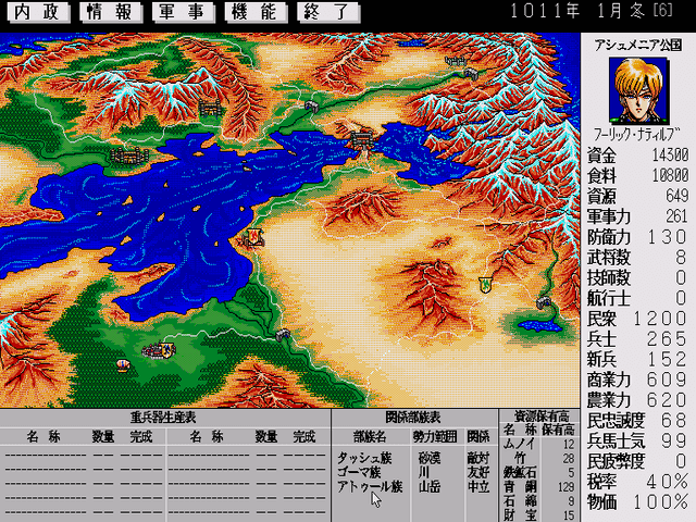 Joshua is a grand strategy game set on the fictional semi-medieval continent of the same name. The people of Joshua are skilled in sciences and technology, which were used for good and evil purposes alike, leading to the invention of wondrous flying machines, but also mechanical war devices that allowed certain nations to take over large portions of the continent. The player can choose between any of the three scenarios, taking place during the fictional 10th to 12th centuries of Joshua’s history. The earliest scenario puts the player in control of the small desert nation Rujua; in the middle one the ruler of the Principality of Ashumenia fights against the kingdom of Ishtakar; the final scenario takes place on a part of the continent occupied by the powerful Barm Empire, and the player must resist their invasion as the leader of the kingdom of Ans.