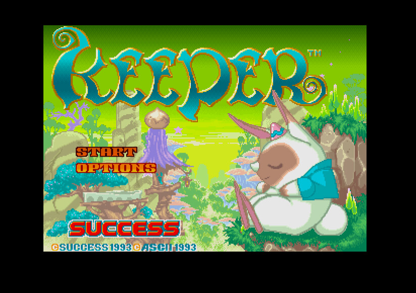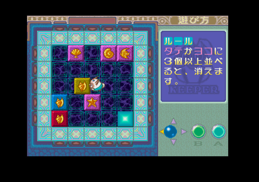 Keeper is a cute action-puzzle game. A five-by-five grid fills up with colored blocks with different icons on them. Pikuru and Kintoto, the player characters, can move freely about the grid, climbing over the blocks, and pushing or pulling them in any direction where there is room. Line up three or more blocks of either the same color or the same symbol and they will disappear. If the entire grid fills up, the game ends.