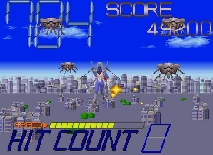 Neural Gear is a pseudo-3D scrolling shooter similar to Space Harrier. You play as Emi T. Fonon, a futuristic soldier from the years after World War IV, who wears a bio-powered suit that can fly back in time and destroy time travelling robots. Each level goes back to an earlier date and has more numerous and powerful enemies.