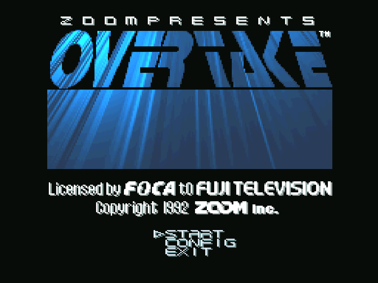 Overtake (オーバーテイク) is a 1992 Sharp X68000 Formula One arcade racing video game produced by ZOOM Inc. and licensed by FOCA to Fuji Television.