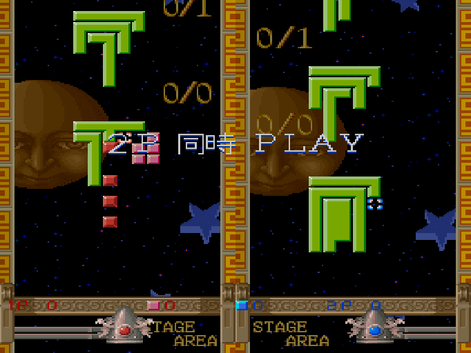 Quarth is a typical puzzle/arcade game. Quarth can be moved from right to left while the screen scrolls down. The playing field is filled with different blocks and your aim is to fill them in so they form complete rectangles or squares. Only when you succeed in this mission, the concerned blocks will disappear. New ‘unformed’ blocks appear while the playing field scrolls down making you play into full action at all times. As soon as a line of blocks reaches the bottom line, it is Game Over. Then you’ll be granted 10 seconds to decide if you want continue the level. Each Level consists of 9 Areas and you progress to the next level once you’ve cleared the last area. The Battle mode is a dual player mode.