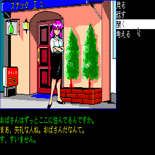 Rouge: Manatsu no Kuchibeni is an Adventure game, developed and published by Birdy Soft, which was released in Japan in 1990. In this game, the protagonist’s father dies and leaves the will for his son to take care of his secret daughter Eriko in Yokohama or get stripped from inheritance. The hero sets off to Yokohama while having only the picture of the girl. This is one of the most beautiful games of Birdy Soft – and heroines here are very lovely. The bigger part of the game we just search for Eriko while getting information from neighbors and friends. And here comes a big “but” – but the hero actually lays down with each such friend or neighbor to know a piece of information. Add to that a very tragic story of Eriko revealed later and we get a really dark-themed game – which is not necessarily bad.
