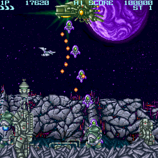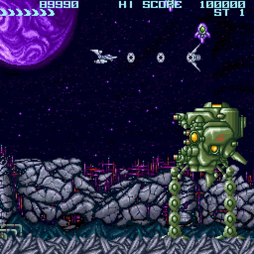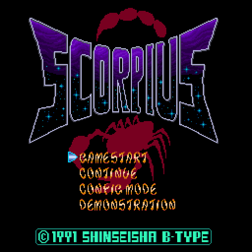 Scorpius is a horizontally scrolling shoot-em-up in which the player can choose to control one of the three available spaceships on their way through exotic planets populated by hostile alien races. The ships vary in shape and use modified versions of basic weapon types. Each ship starts with a low-damage gun and can upgrade and change the weapon to spreading fire, slow but powerful lightning attack, and others. The ships are also equipped with a claw-like tail, which is activated with a separate button. The tail can attack enemies in a circular motions and retracts back to the ship. Most stages require alternating between firearms and the tail for successful completion.