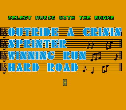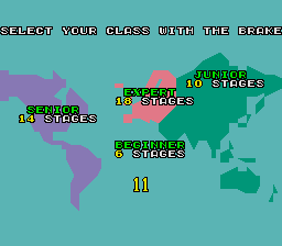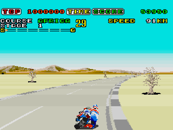 In Super Hang-On you race a motorcycle around the world, completing each section of track within a time limit. There are other bikes on the road, but beating this is not important, so they can be thought of as moving obstacles. Each continent is a different difficulty level: Africa is beginner, Asia is junior, the Americas are senior, and Europe is expert.