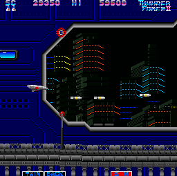 Thunder Force II is both a side scrolling and top down shooter. In the game you control a ship. In some stages the action is side scrolling and in others it is top down (overhead). The weapons systems is fairly basic. You can switch from shooting a more powerful weapon straight ahead or two less powerful guns shooting forward and backward simultaneously. There are various power-ups that improve your fire power.