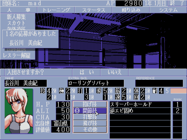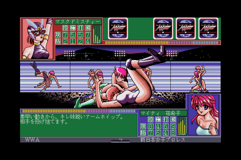 Wrestle Angels 3 is, like its predecessors in the series, a turn-based wrestling-themed game. The player takes the role of the manager of a new company that represents and trains young wrestlers, guiding them to participate in an all-female league. Wrestlers can be selected and hired either directly by following the league’s records, or by scouting the city and recruiting suitable candidates. Afterwards the wrestlers can be trained by choosing and investing points into particular moves. It is also possible to send them on vacations. Most actions in that preparation mode cost action points (AP); running out of them ends the turn.