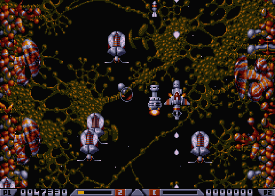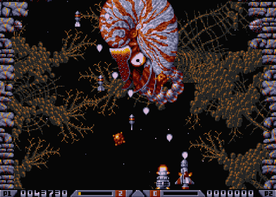 Xenon 2: Megablast is a vertically scrolling space shooter, in which you have to pass several levels, filled with waves of enemies, that all end with a level boss creature. Each group of enemies you destroy grants you a cash reward and every once in a while you enter Colin’s Bargain Basement, where you can use this cash to purchase upgrades for your ship like better weapons, speed & health upgrades etc. Some upgrades can also be picked up during the levels.